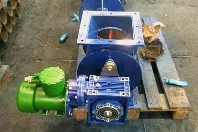 Питатель шлюзовый в общепромышленном исполнении производительностью 3 м3/час. Материал транспортирования цемент. Входной фланец Ø150 мм, выходной фланец 200х200 мм.